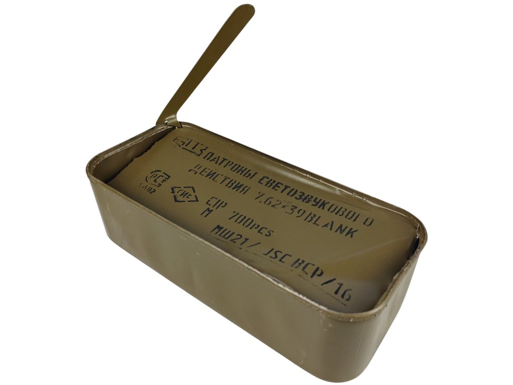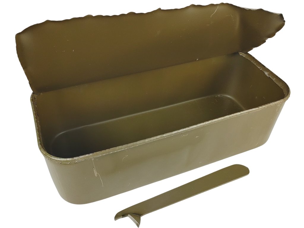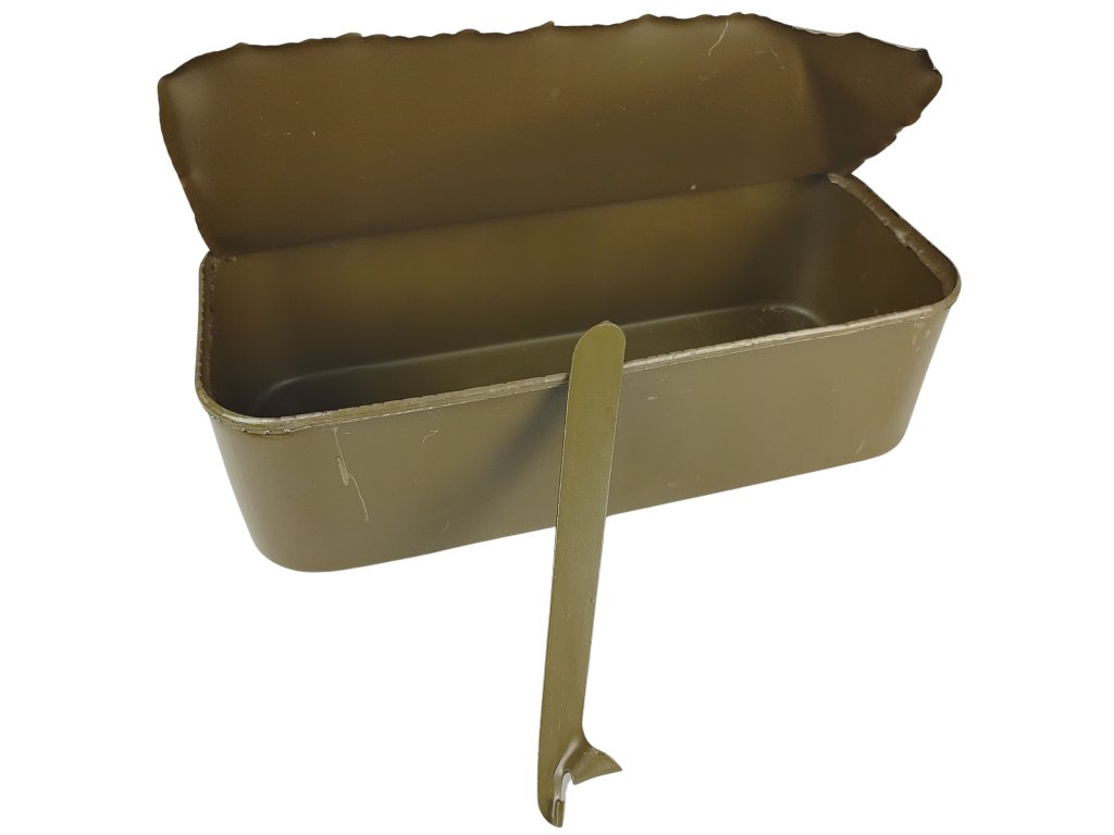 Sovětská plechová muniční prázdná schránka od střeliva, včetně robustního otvíráku, který slouží k jejímu prvotnímu otevření.