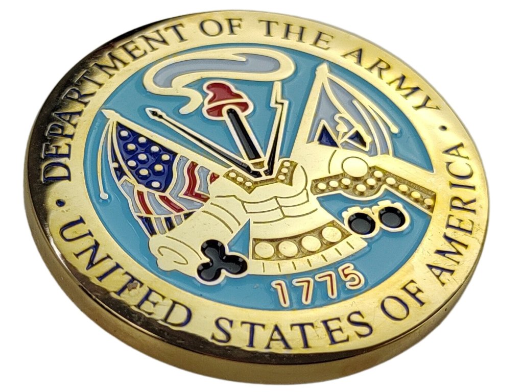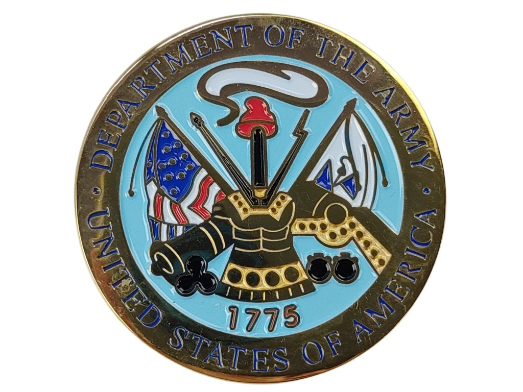 Přední strana (levá mince na obrázku):Zobrazuje pečeť Ministerstva armády Spojených států (Department of the Army), s nápisem „UNITED STATES OF AMERICA 1775“. Pečeť obsahuje římskou zbroj, dělovou hlaveň, prapor s hvězdami a další symboly spojené s americkou armádou.