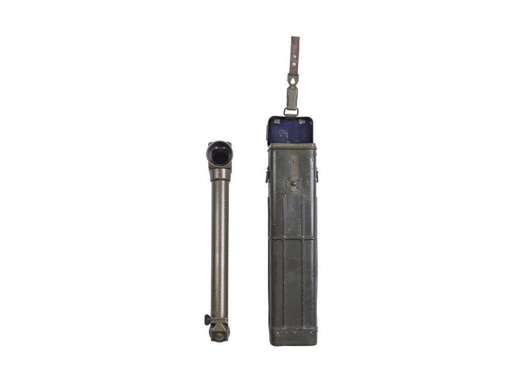 Originální polní periskop z dělostřelecké buzoly uložený v bytelném kovovém pouzdře, používaný maďarskou lidovou armádou v dle paktu Varšavské smlouvy.