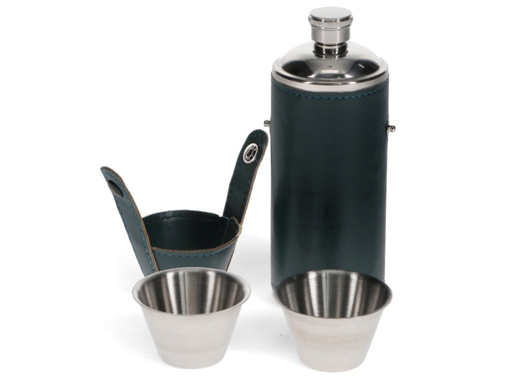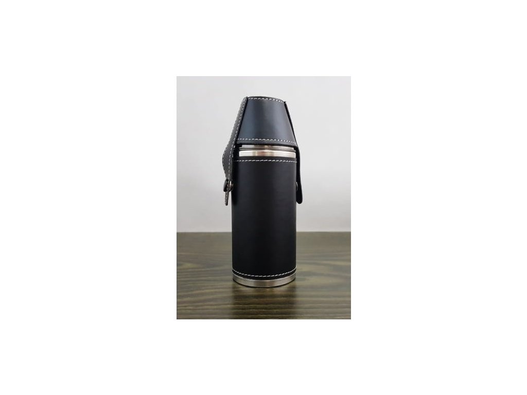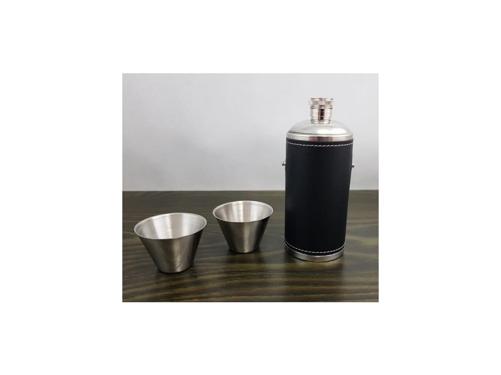 - Cestovní lahev na alkohol s koženým krytem a 2 šálky.