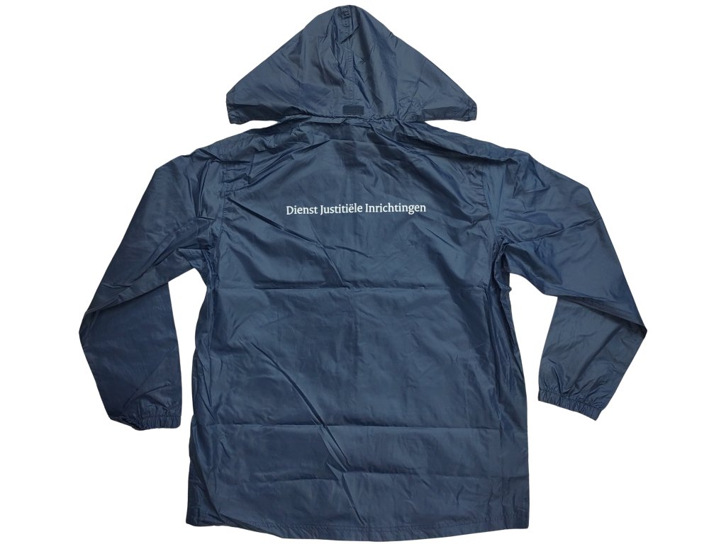 Pláštěnka, modrá bunda s kapucí, na jejíž zadní straně je bílým písmem nápis "Dienst Justitiële Inrichtingen". Jedná se o pláštěnku, kterou používá nizozemský vládní orgán pro vězeňství a justiční zařízení (DJI). Pláštěnka má jednoduchý design a je vyrobena z nepromokavého materiálu.