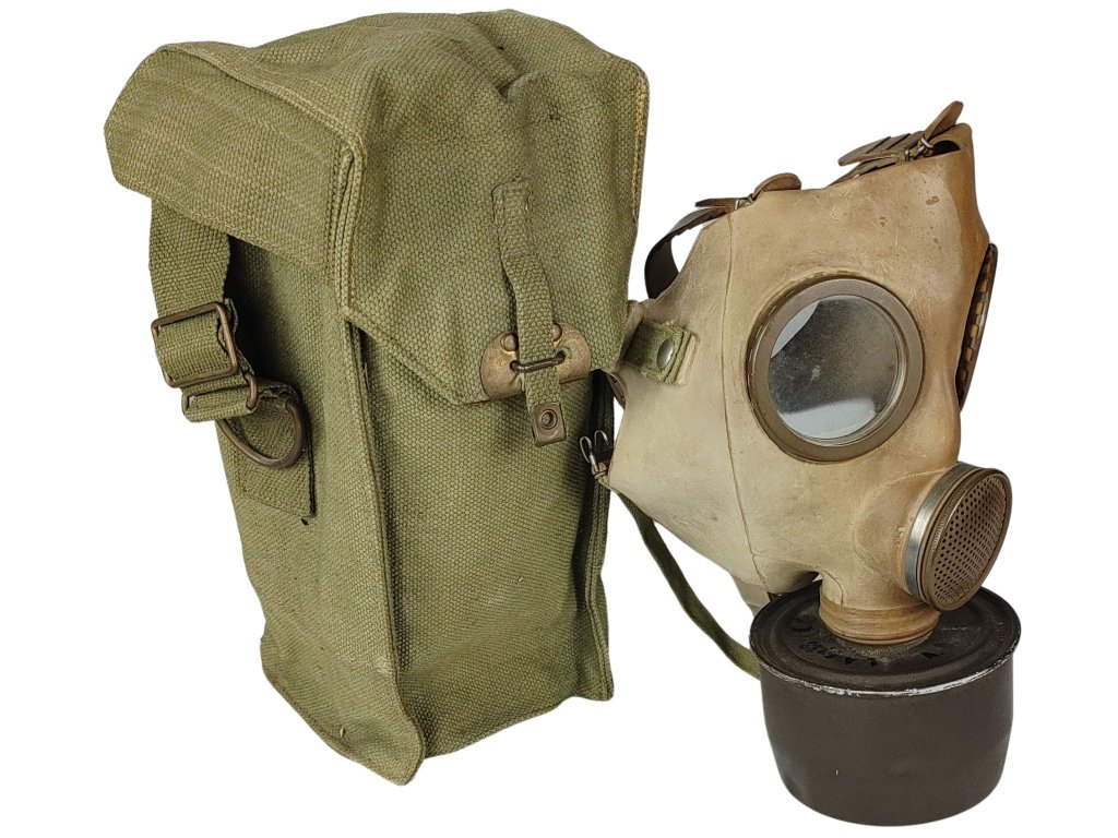 - Kompletní ochranná souprava belgického vojáka, která se skládá z plynové masky, filtru a přepravní plátěné brašny.