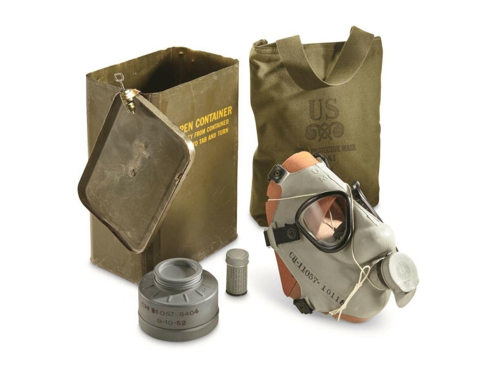 - Plynová maska s filtrem a přepravní látkovou taškou s nápisem "US".