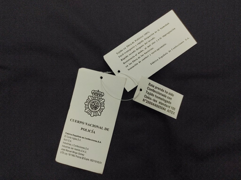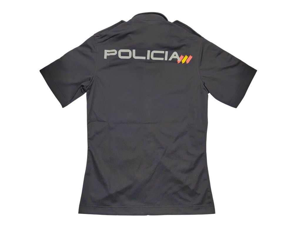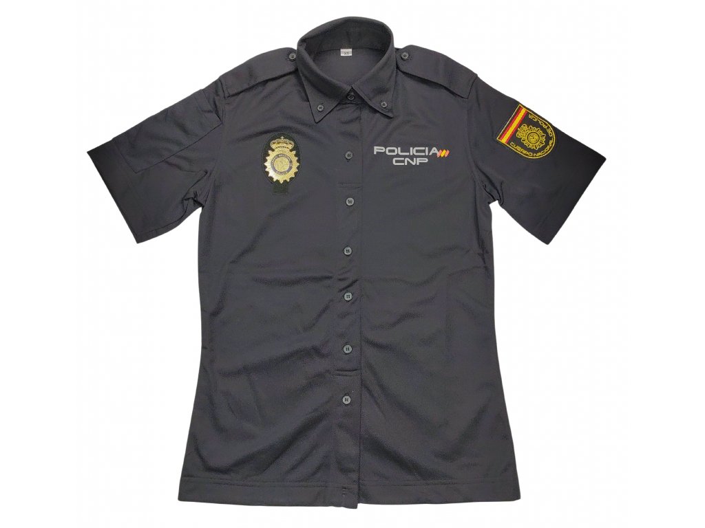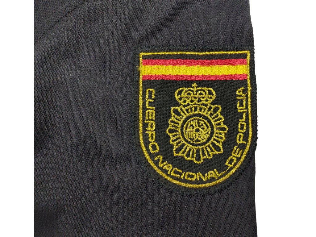- Krátký rukáv zakončený obšitým lemem, na pravém rukávu nášivka s policejním logem a španělským nápisem Cuerpo Nacional de Policía.