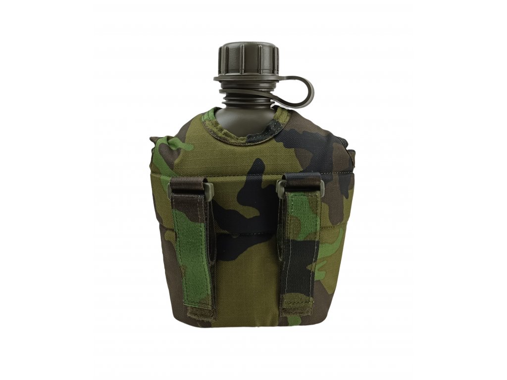 Kompletní polní láhev systému MNS české značky SPM-Liberec v zeleném lesním potisku vzoru 95 včetně potištěných popruhů.