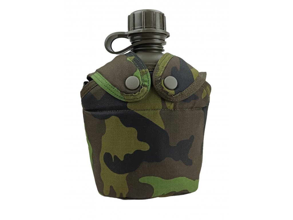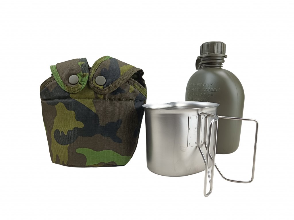 • celý komplet obsahuje: plastová polní láhev s uzávěrem, nerezový šálek, obal v maskovaném provedení