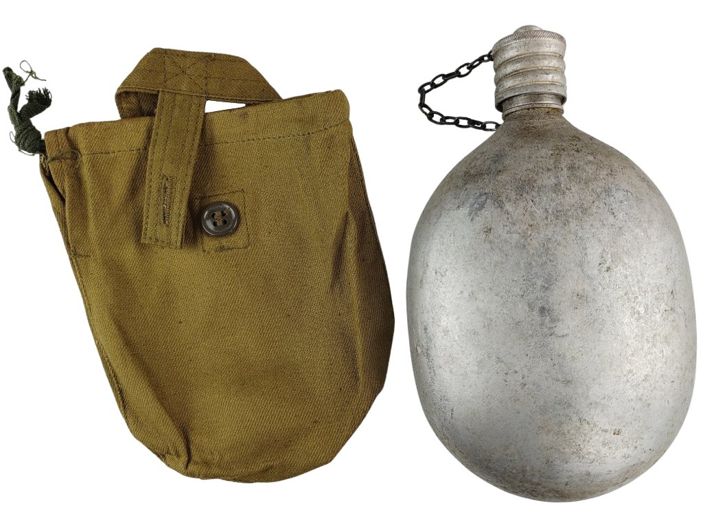 Autentická polní láhev SSSR z roku 1953, používaná sovětskou armádou v poválečných letech a během studené války. Jedná se o klasickou sovětskou čutoru vyrobenou z hliníku s objemem přibližně 750 ml (3/4 litru) se šroubovacím víčkem připevněným řetízkem. Hliníková varianta šedé barvy bez vnějšího zeleného nátěru.