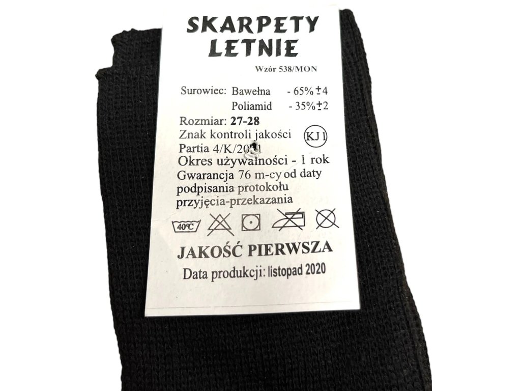 Letní černé ponožky "SKARPETY LETNIE Wzór 538/MON" z vybavení polské armády. Pohodlné a ideální pro všechny typy vojenské i civilní obuvi. Průměrná životnost těchto ponožek je přibližně 2 roky. Materiálové složení minimalizuje pocení nohou. Jsou tenčí a pohodlnější v teplejších dnech, vhodné pro použití, když teploty neklesají pod bod mrazu.