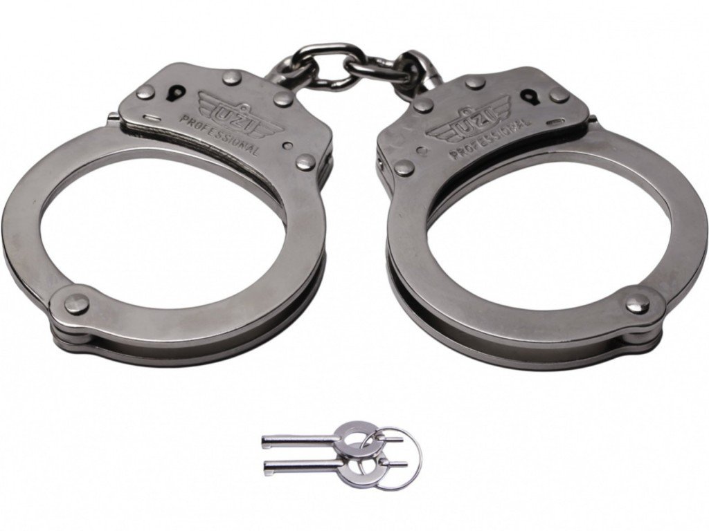 - ocelová zaklapávající pouta na obě ruce v barvě chromu