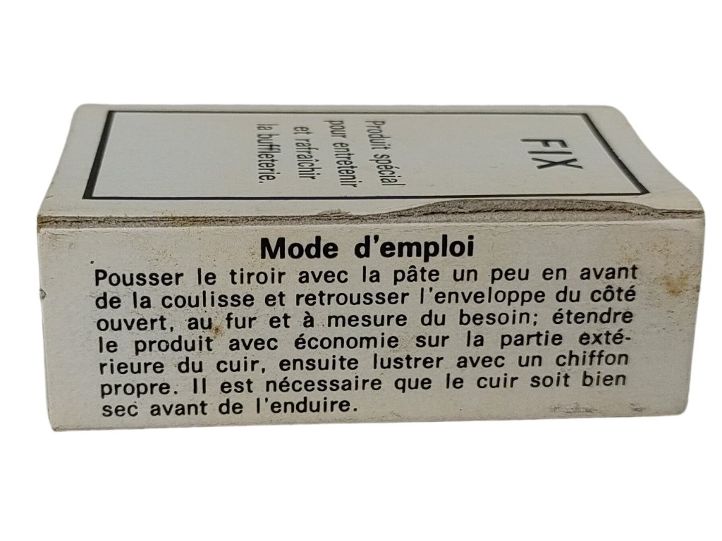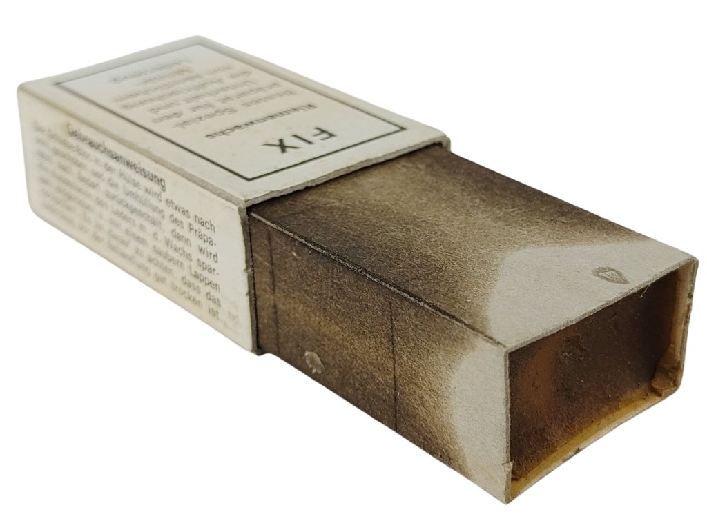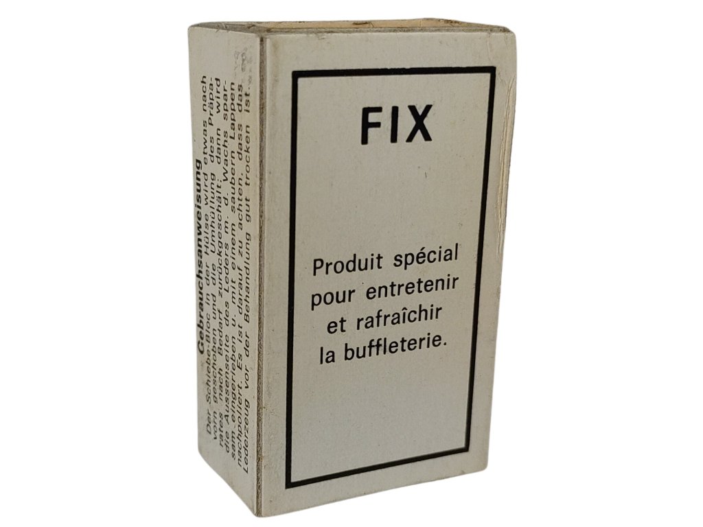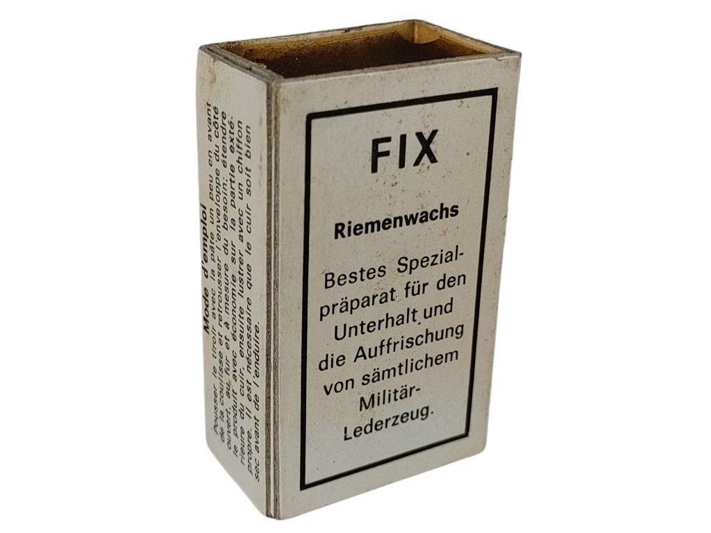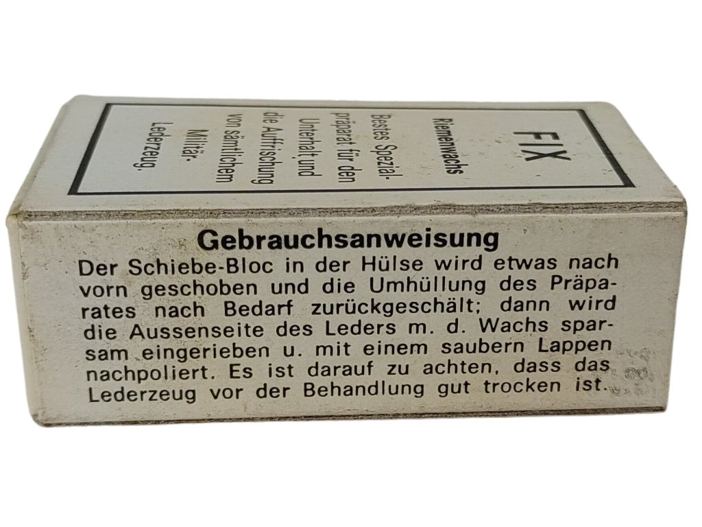 Přípravek FIX Riemenwachs, což v překladu znamená vosk na řemeny nebo kůži. Jedná se o speciální přípravek určený k údržbě a osvěžení veškerého vojenského koženého zboží.