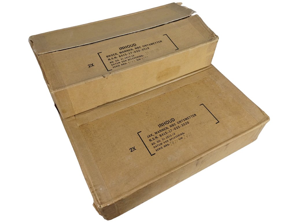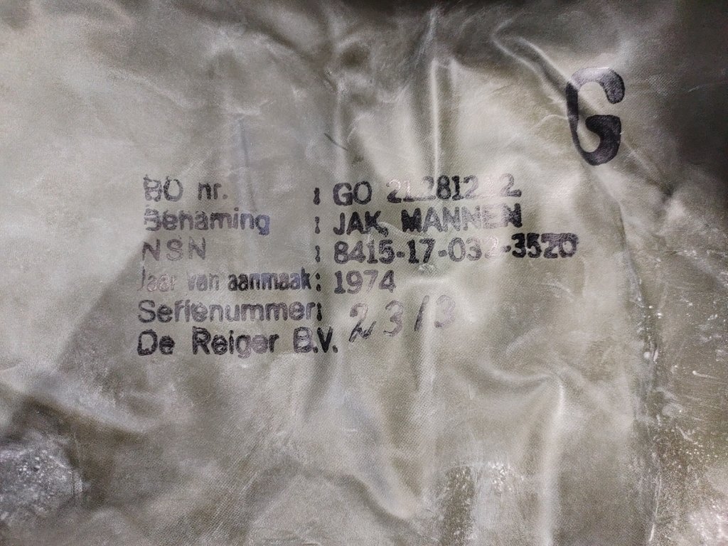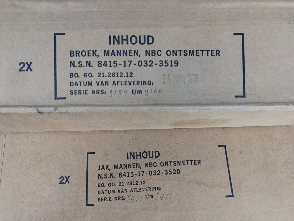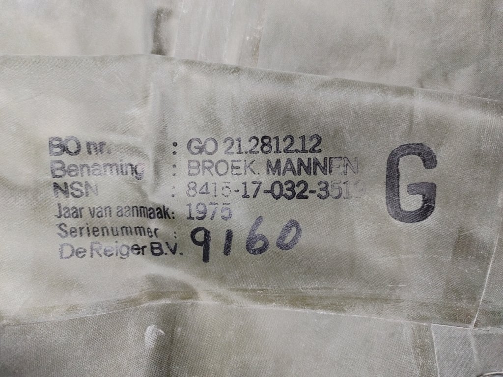 Nepoužité zásoby z přebytků nizozemské armády, vyrobené průběhem 70. let 20. století. Komplety jsou ošetřeny klouzkem proti přirozenému stárnutí materiálu, a jsou uloženy v původních papírových boxech po 2 kusech v balení, uvedena cena je za 1 díl oděvu - kalhot nebo bundy.