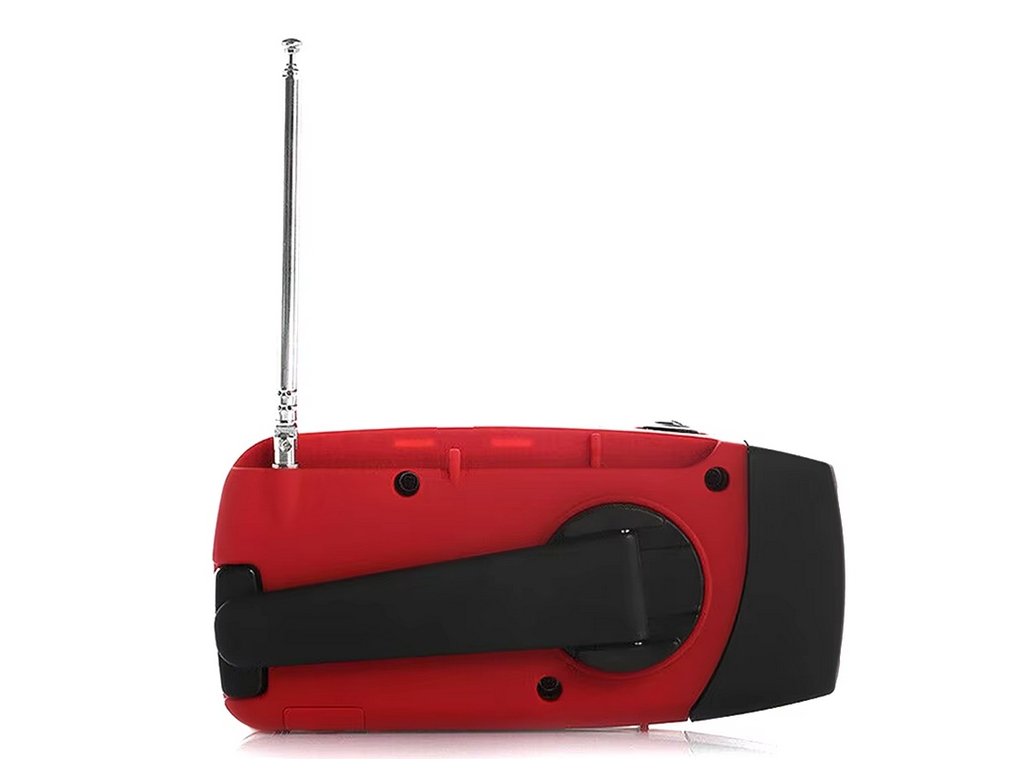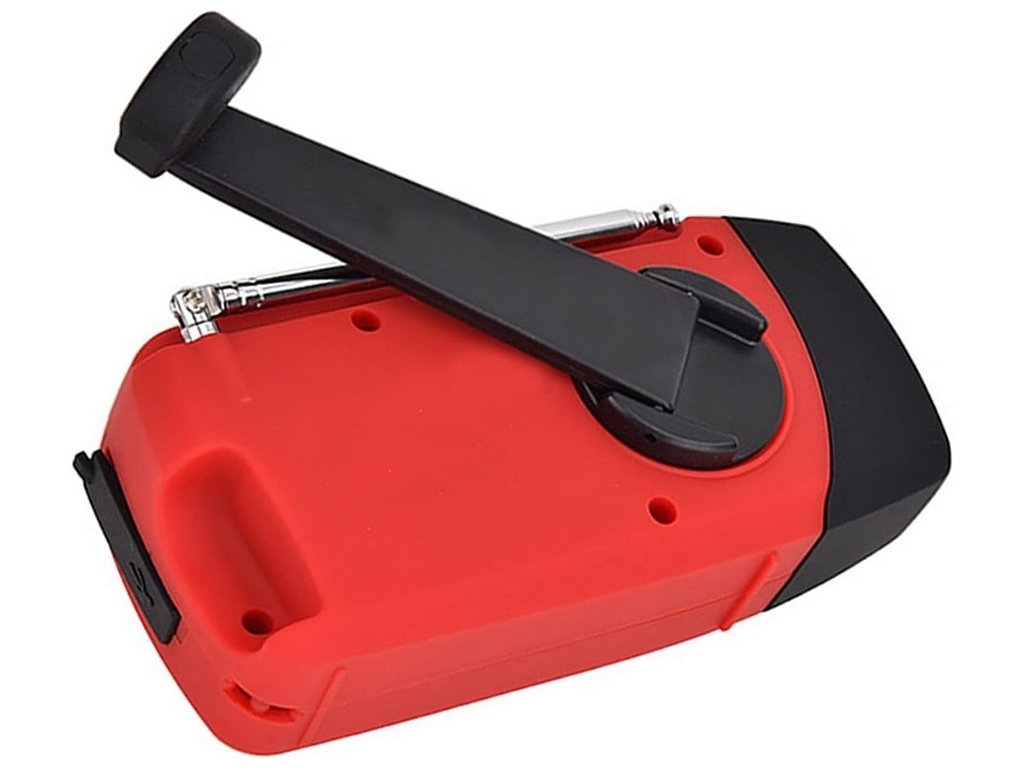 - Nabíjení ruční klikou: Zvedněte kliku. Při prvním použití rádia nebo pokud nebylo rádio používáno déle než 60 dní, otáčejte ručně klikou ve směru nebo proti směru hodinových ručiček po dobu 3 až 5 minut pro aktivaci vestavěné baterie. Červený indikátor se rozsvítí, když se rádio nabíjí. Pokud nabíjíte rádio ručně nepřetržitě, třeste ručním joystickem nepřetržitě po dobu 1 minuty (frekvence ruční kliky >= 130-krát), můžete používat svítilnu po dobu 15~20 minut; přehrávání rádia (při střední hlasitosti) po dobu 15~20 minut; nabíjení mobilního telefonu (Smartphone) po dobu 3~5 minut.