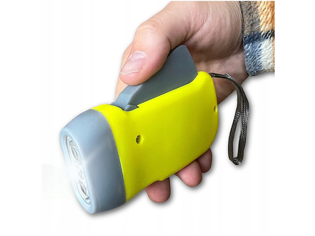 Diodová svítilna na dynamo se 2 nebo 3 LED (různé designy), nabíjená kinetickou energií. Ruční svítilna s dynamem (tzv. "hand-pressing flashlight" nebo "hand-crank flashlight").