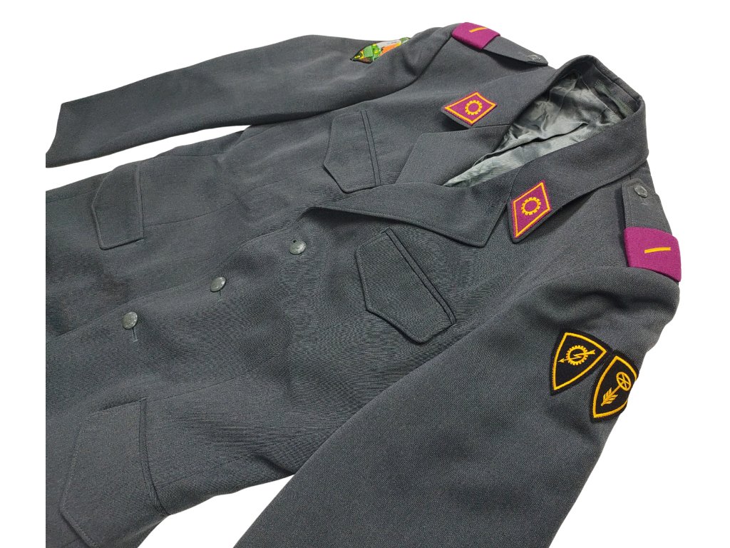 - Vzhled: Tmavě šedá barva, zapínání na kulaté plastové knoflíky s švýcarským křížem, dvě náprsní a dvě boční kapsy s klopami.