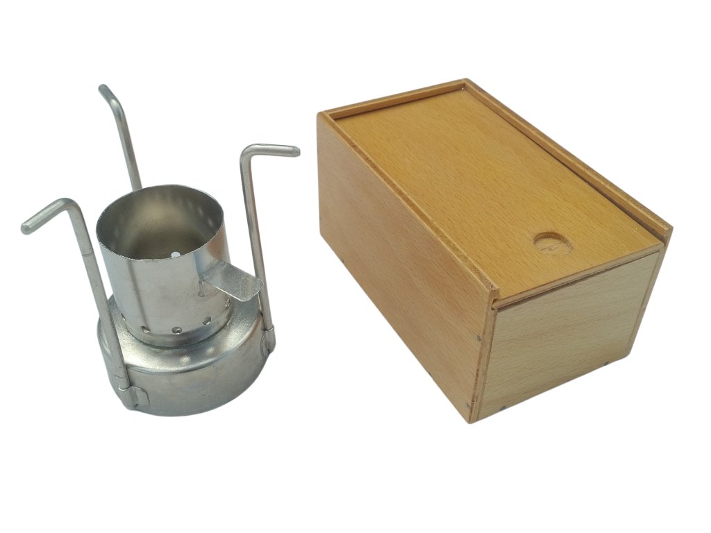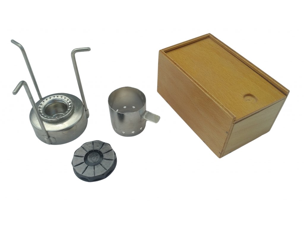 Skládací nerezový vařič na tekutý líh Československo v boxu retro originál
