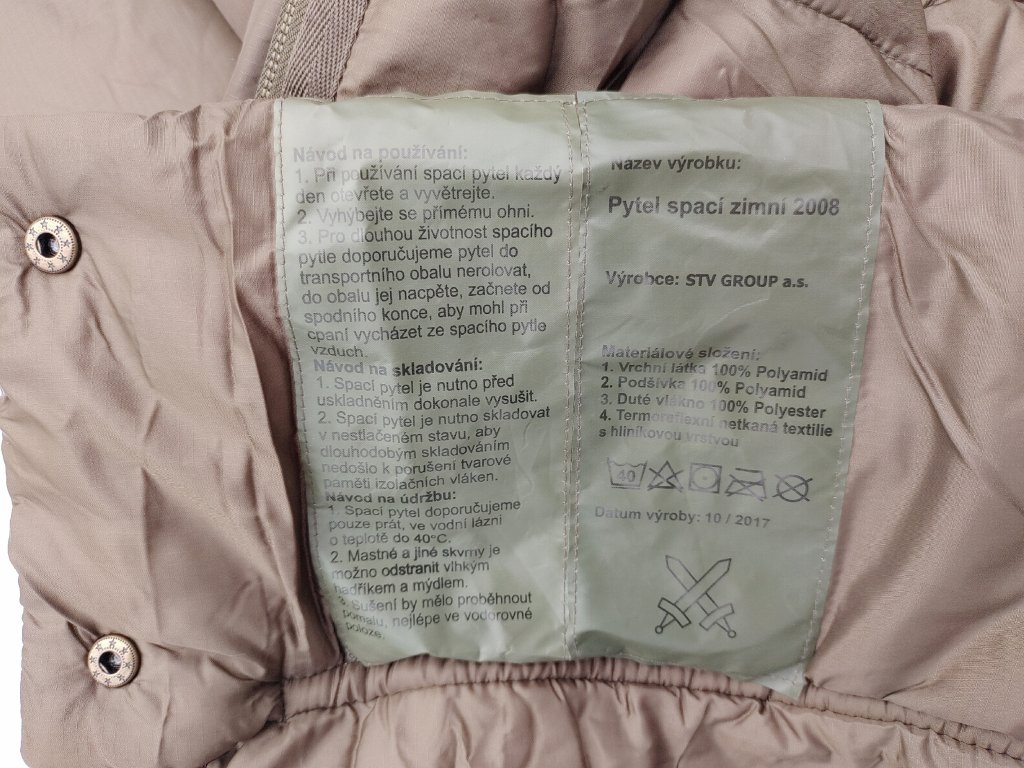 Pytel spací zimní 2008 - včetně kompresního obalu. Jde o originální výstrojní součástku AČR. Pytel spací zimní 2008 (dále jen pytel) je určen k odpočinku pro příslušníky AČR ve středoevropských a chladných klimatických podmínkách při teplotách do –20 °C. Výrobcem je česká společnost STV GROUP a.s..