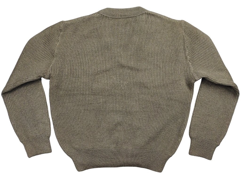 Originální vlněný svetr francouzské armády ze 70. - 80. let 20. století. Tento střih svetru je vyroben z měkčí vlny, která je směsí česané vlny a chlorovlákna. Je silný a má výstřih do V, elastický pas a manžety. Příjemný a nekousavý materiál na dotek.