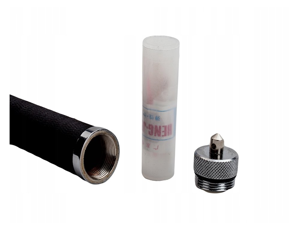 - Šroubovací krytka s otvorem na šňůrku v zadní části rukojeti ukrývající malou sadu nástrojů pro přežití (mini kompas, zápalky se škrtátkem, náplast, vlasec a háček).