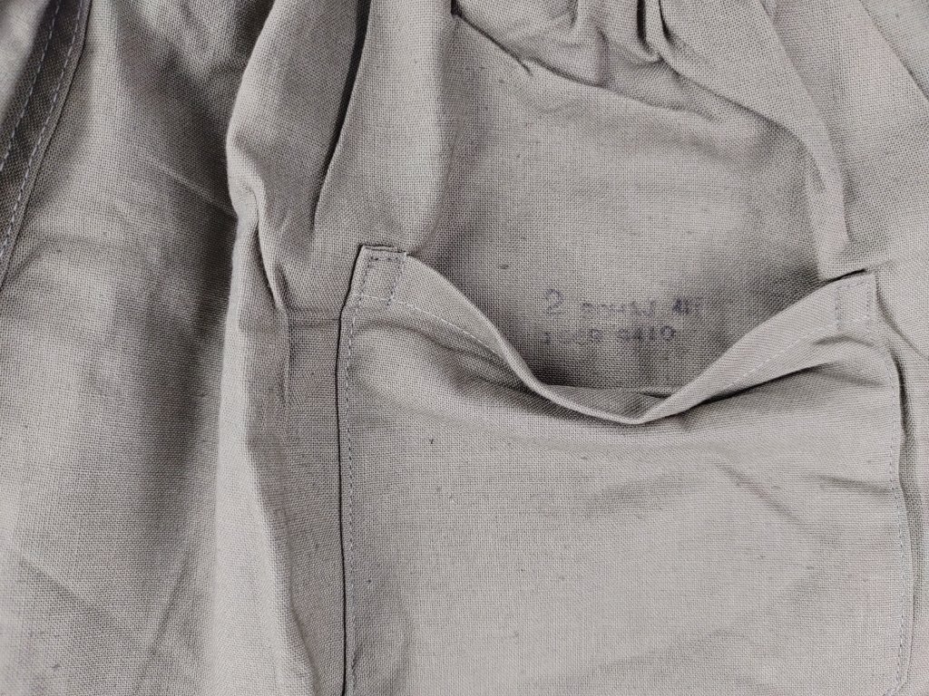 - Vyrobeno v Československu z prvotřídní bavlněné tkaniny s příměsí viskózy zelenohnědé barvy khaki.