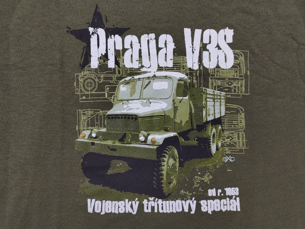 - detailně propracovaný barevný potisk v přední části s motivem legendární Praga V3S vojenský třítunový speciál