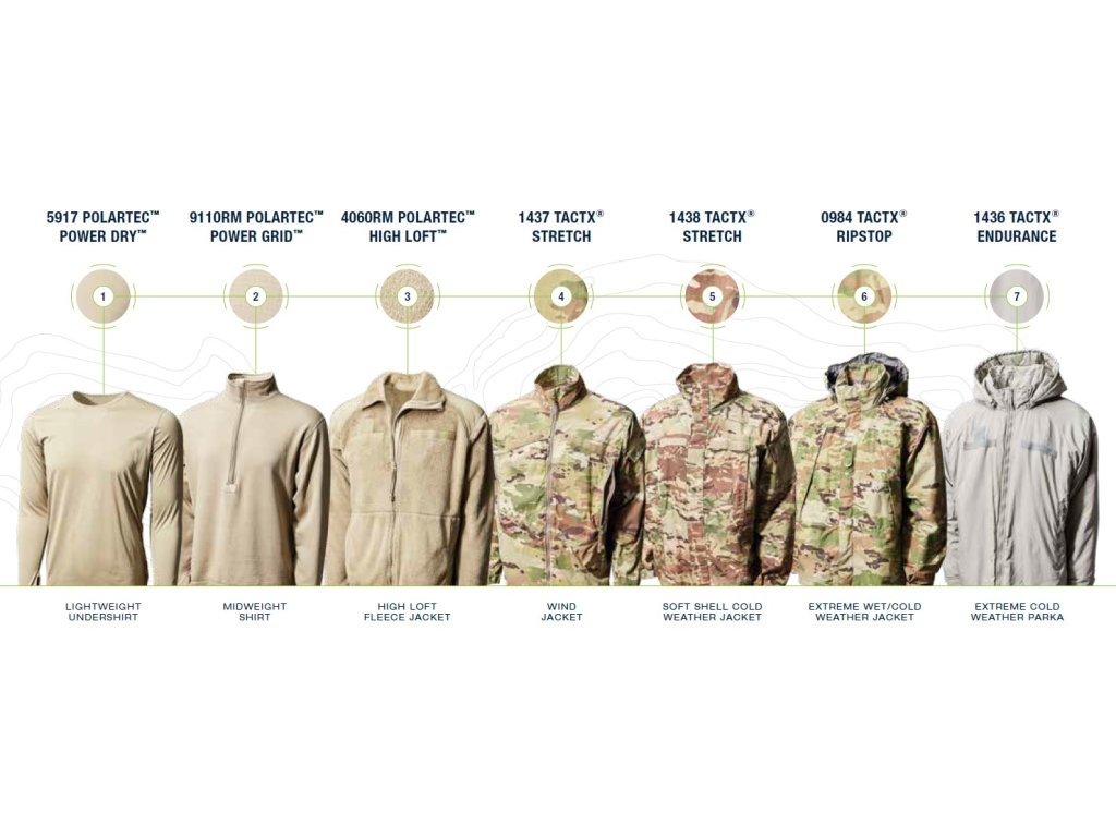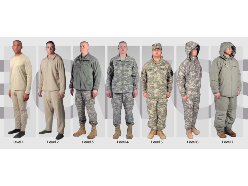 - Level VII: Extreme Cold Weather soft shell with PrimaLoft Silver Insulation USA Parka & Trousers (Měkká skořepina pro extrémní chladné počasí se stříbrnou izolací PrimaLoft USA Parka a kalhoty).