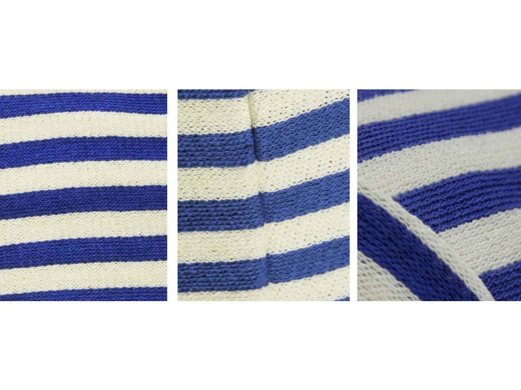 Barva: Tričko má vodorovné pruhy střídající světle modrou a bílou barvu.