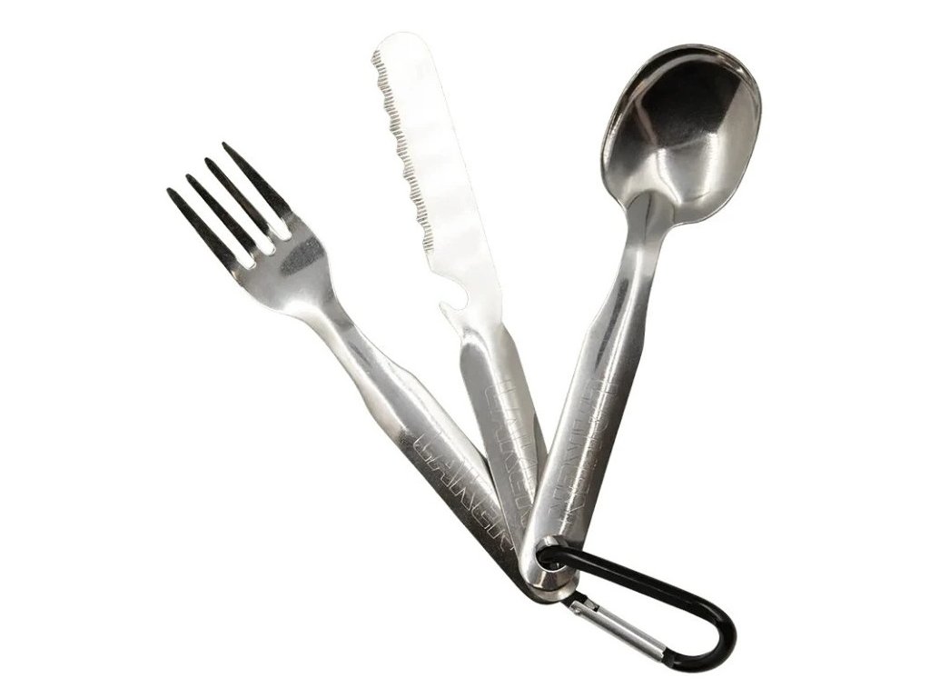 - Sada nerezových příborů s karabinou (lžíce, vidlička, ostrý nůž).