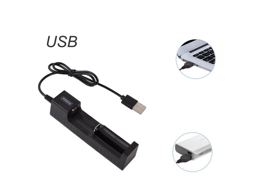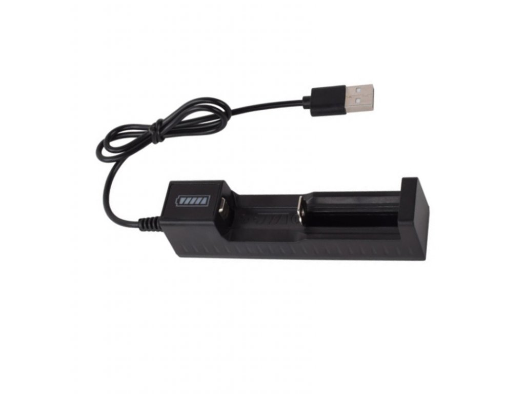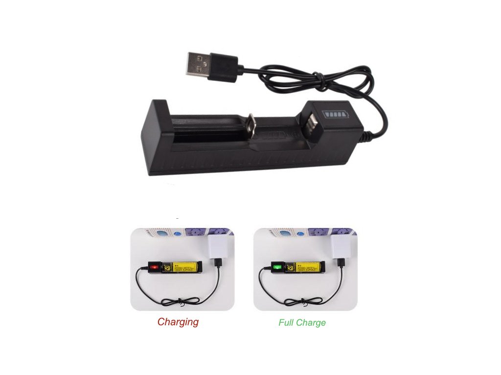 Nabíječka USB s jedním nabíjecím slotem. Určena k nabíjení 1ks Li-ion nabíjecí baterie. Nabíječka se připojuje do libovolného zdroje s USB výstupem s proudovým výstupem 500mAh. Po vložení akumulátoru do nabíječky se kontrolka rozsvítí červeně, akumulátor se nabíjí. Po nabití akumulátoru se kontrolka rozsvítí zeleně. Nabíječka je řízená mikroprocesorem