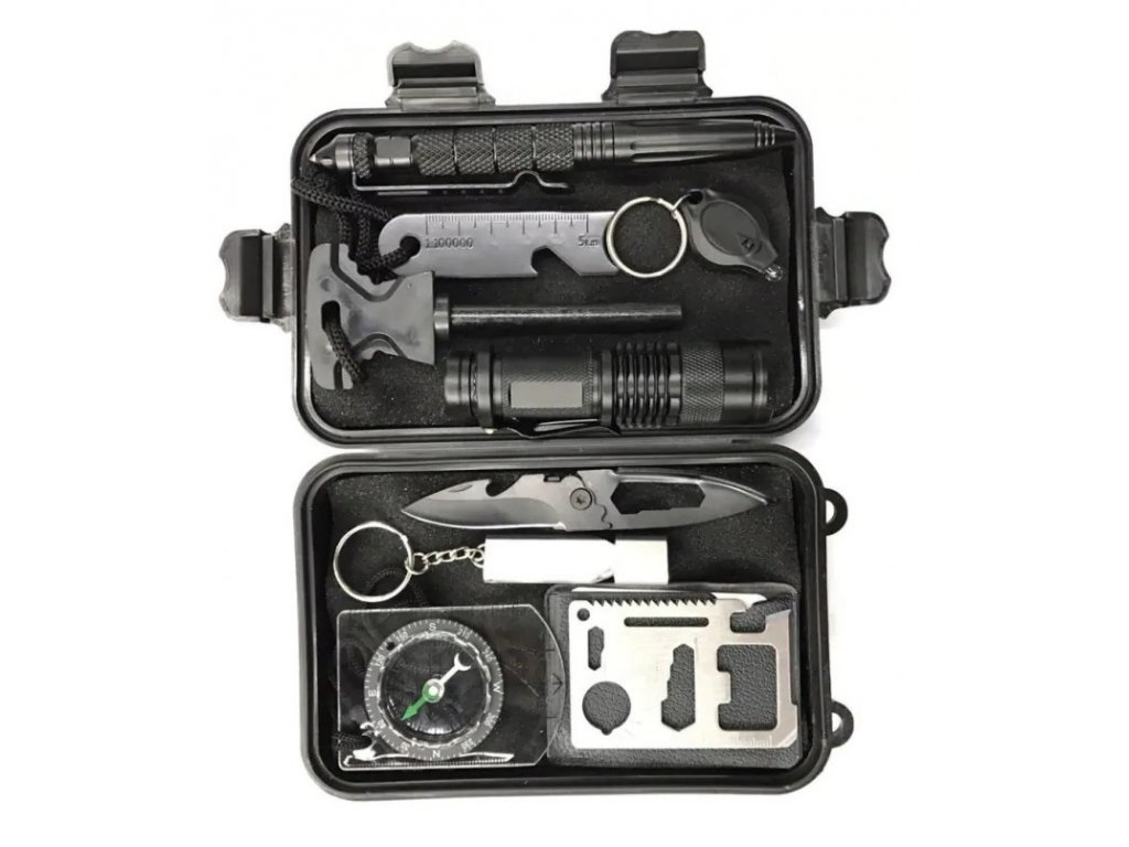 - Sada je složena z řezné struny pro řezání dříví, velkého křesadla 8 mm, kartového multifunkčního nástroje, kapesního zavírací nože, kovovou píšťalkou s kroužkem na klíče, obranné taktické pero s hrotem, taktickou LED svítilnu s klipem (baterie AA 1,5V R6 není součástí), menší LED svítilnu s kroužkem na klíče (baterie součástí), a kompas / mapovku. Vše je uloženo v ochranném, uzavíratelném plastovém pouzdře / boxu černé barvy.