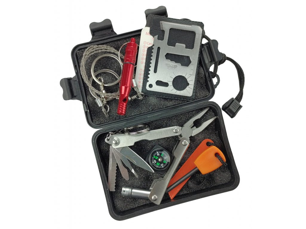 Sada je složena z řezné struny pro řezání dříví, kartového multifunkčního nástroje, multitool kleští s LED svítilnou, kompasu, křesadla pro zapálení ohně a nakonec píšťalky. Vše je uloženo v ochranném, uzavíratelném pouzdře.