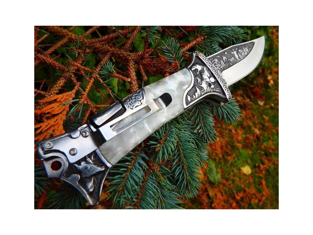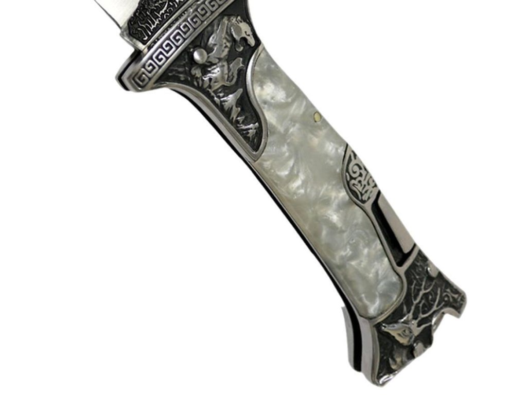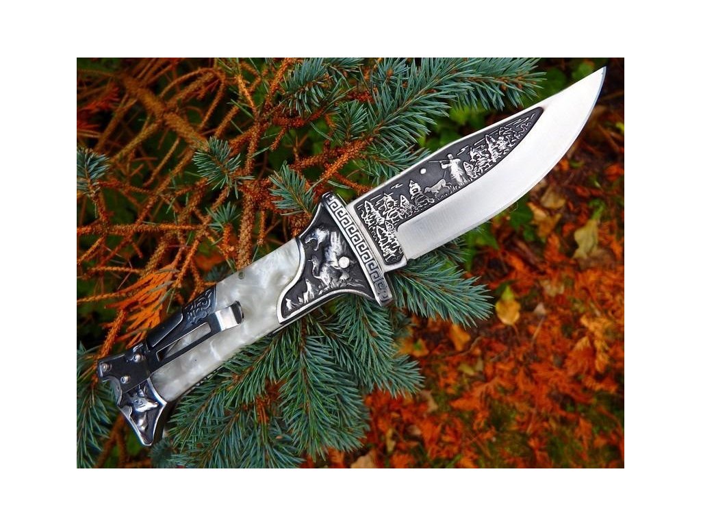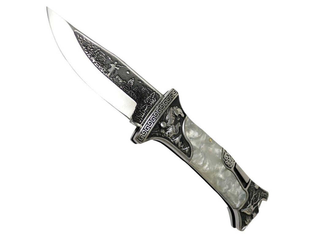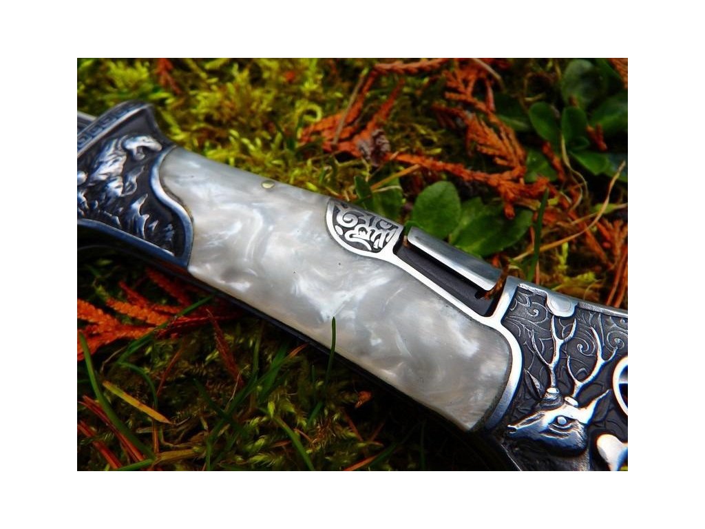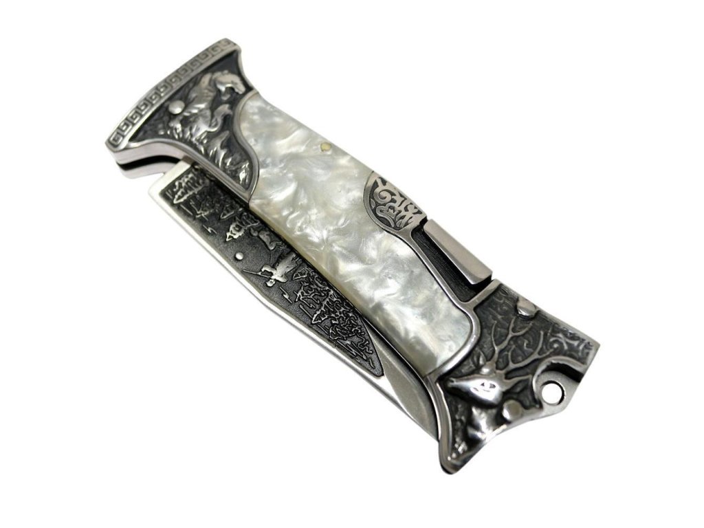 Čepel i rukojeť tohoto nože jsou vyrobené z kvalitní nerezové oceli. Kromě vyčerněné rytiny vás na čepeli zaujme také profil tvaru Trailing point, která se perfektně hodí pro kuchání a zpracování ulovené zvěře. O bezpečné zavírání nože se stará kovová pojistka typu Back-Lock, umístěná na zadní části rukojeti. Rukojeť má pryskyřicové střenky imitující bílou perleť. Jinak je tento masivní zavírák kompletně kovový. Na obou stranách najdete detailní rytiny přírodního tématu zobrazující postavu myslivce se psem v lese, jelena a tygra. V ocelové hlavě rukojeti je otvor pro provlečení jistící šňůry.
